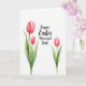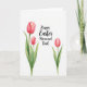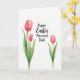 Designed with soft watercolor florals on a white background, this card shows three blooms arranged like a small bouquet that feels quietly affectionate 🌷. On the left, a tall open flower fades from coral-pink at the edges into a pale blush near the center, with a smaller bud leaning close beside it as if keeping company. On the right, a single bloom rises on a green stem, angled slightly toward the pair, creating a gentle sense of connection across the space 🐇. The paint looks light and translucent, letting the petal colors and layered greens show through in soft washes and subtle shading. In the upper-right area, a short greeting sits as the main text, written in dark ink with flowing letterforms that stand out against the white. The lettering balances the flowers without crowding them, leaving plenty of open space that makes the scene feel calm and intimate. Fine brush details define the stems and leaves, and the coral-to-blush petals are the brightest accents on the page.