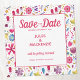 A modern watercolor painting of flowers and leaves in rich colors scattered on a white background. A gorgeous coordinating Save the Date invitation which you can alter to suit your own celebration. Original art by Nic Squirrell.