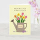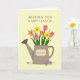 This card features a soft spring illustration on a pale cream background, centered on a taupe watering can sitting across the lower half of the design. From the spout, a generous spray of flowers rises upward like a shared bouquet, with pink blossoms nestled close to orange tulips and bright yellow trumpet-shaped blooms, tied together by fresh green leaves 🌷. The close clustering of the blooms gives the scene a friendly, affectionate feel, like something offered with a gentle smile. Near the top, a seasonal greeting appears in warm brown lettering, placed above the flowers so it stands out without crowding the artwork. On the watering can’s front, a small label holds a short closing phrase in a darker tone, adding a quiet, caring note to the main message 🐰. The overall palette stays soft and calm, with pastel colors balanced by the neutral can and open background. Along the bottom edge, tiny purple flowers are scattered in a loose line beneath the watering can.