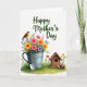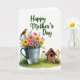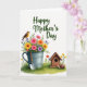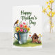 This design shows a bright garden scene on a white background, centered on a sturdy metal watering can overflowing with spring flowers in fuchsia, sunny yellow, orange, and soft lavender, with leafy greens curling around the blooms ❤️. A small brown bird with a yellow chest perches on the rim and turns its head as if watching a companion just out of view, adding a gentle, friendly moment to the scene. Near the base of the flowers sits a garden trowel with a wooden handle, angled like it was just set down after tending the plants. On the right side, a wooden birdhouse rests in thick green grass, its round doorway facing forward like a welcoming little home. In the foreground, a tiny snail with a spiral shell inches along, giving the layout a calm, unhurried rhythm 🌼. The message text appears above the illustration in flowing, calligraphy-style lettering, colored deep emerald green and centered near the top. Soft, painted textures on the petals and leaves contrast with the watering can’s muted metallic shine. The grassy area is brushed in layered greens, with the birdhouse outlined in warm wood tones and a darker circular opening.