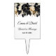 This wedding cake topper is shown with a lovely black, ivory and gold colored floral bouquet with bride and groom personalized names and wedding date.