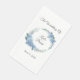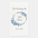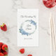 This wedding guest towel paper napkin is shown in a lovely watercolor floral wreath print of blue hydrangeas, text is shown in a slate gray color.