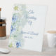 This wedding pedestal sign is shown in a lovely watercolor floral print in blue and white colors, text is shown in a dusty blue color.