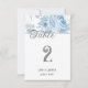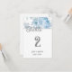 This wedding table number card is shown in a modern layout with a lovely blue peony floral print with a white matte paper choice.