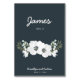 Floral wedding place cards table cards with white flowers and customizable text printed on dark background