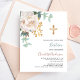 A white flower, florals, eucalyptus greenery and a golden cross. Personalize and add a name and details.