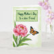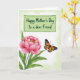 Designed with a soft, nature-inspired illustration, this card features a large pink flower opening across the lower left, its layered petals curling outward to reveal a warm golden center. On the right, a winged insect hovers nearby, angled toward the bloom as if drawn in by it, adding a gentle sense of closeness ❤️. Its wings are deep orange with dark vein lines, finished with small blue and amber dots along the edges that feel like tiny sparks of color. Above the scene, a neatly outlined rectangular panel holds the greeting, set in flowing green lettering that sits centered within the frame. The words are arranged in a few short lines, leaving comfortable space around them so the message feels calm and easy to read. Behind everything, a pale green wash suggests an outdoor setting, like light filtering through garden leaves 🌼. The pink blossom’s curled petals and the insect’s speckled wing tips stand out crisply against the soft green background.