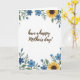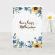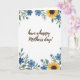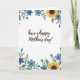 This design shows a bright white background with a warm Mother’s Day greeting placed right in the center, written in flowing brown lettering that feels gentle and affectionate ❤️. A painted floral border wraps around the message, creating the sense of a caring embrace rather than a stiff frame. On the left side, clusters of deep blue and light blue blossoms mingle closely, some dotted with tiny orange-yellow centers like little sparks of warmth. Broad green leaves and slim stems weave between the flowers, leaning inward as if they’re quietly admiring the words in the middle. In the upper right and lower right corners, two large golden flowers open wide, their dark, textured centers adding a cozy contrast that brings a friendly, sunlit mood 🌼. The text stays clear and easy to read against the white space, with the brown color echoing the natural tones of the stems and flower centers. Cool blues and warm yellows balance each other across the border, while the greens soften the transitions and keep the layout feeling calm. The corner blooms show long yellow petals radiating outward around deep brown centers, with layered leaves tucked just behind them.