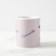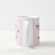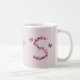 This beautiful and unique morning coffee or tea mug features a large letter S monogram initial. The letter S is created with pink flower petals and purple beads. Two purple butterflies flutter around the letter. The handmade letter is featured on either side of this mug with room in the center to personalize with your name.