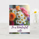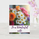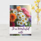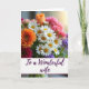 This greeting card features a lush bouquet filling the upper two-thirds, with white daisy-like flowers spreading crisp petals around sunny yellow centers ❤️. In the left foreground, a large orange gerbera-like bloom shows layered petals, adding texture beside fuchsia and soft pink blossoms. Small peach-toned flowers and faint purple accents weave through the arrangement, giving it the feel of a close, affectionate gesture between partners. Warm light falls from the upper right, softly highlighting petal edges and creating gentle shadows that make the flowers look almost touchable. The background stays green and slightly blurred, letting the bouquet stand forward like a tender offering. Across the lower third sits a white banner with a thin pink border, carrying the message “To a Wonderful wife” in dark lettering 🌼. The banner runs horizontally and centers the text, with the bouquet arching above it in a rounded, garden-like cluster. The orange flower leans in from the left while the white daisies and pink blooms gather above the banner against the soft green backdrop.