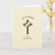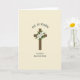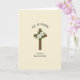 Designed with a central wooden cross in earthy brown, the artwork shows subtle grain lines that give it a natural, touchable look. At the meeting point of the beams, several white, trumpet-shaped blossoms open gently, nestled into deep green leaves, as if arranged with quiet care for someone dear. The creamy beige background keeps everything soft and calm, letting the warm wood and crisp petals stand out without shouting. Above the cross, dark serif text curves in an arch, like a banner, drawing the eye upward in a tender, uplifting way. Below the cross, a second line of matching dark serif text sits straight and centered, grounding the design like a steady promise between close friends. The flowers and greenery add a fresh springtime note 🌷, while the simple layout leaves room for a warm, shared glance 🐰. The final detail is the contrast between the bright white petals and the rich green foliage clustered tightly at the cross’s center.