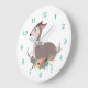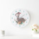 This pretty clock has an image of a resting fawn deer at the center. The fawn lies just behind a floral antler design. Colors include fawn brown, pink, orange, and teal. The teal numbers make the clock easy to read.