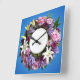 Bring a touch of spring into your room with this Floral Wreath Clock on your wall.. it is always spring time. The wreath is made of several different kinds of flowers and the color of the background can be changed to match your decor exactly.