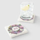 Bring a touch of spring onto your table with these Floral Wreath casters.. it is always spring time. The wreath is made of several different kinds of flowers. It has a natural look because the background of the stone shows through. You can customize the words in the center.