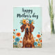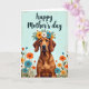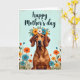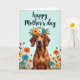This design shows a brown-coated dog with long, expressive ears and a gentle forward gaze that feels like a quiet, loyal “I’m here with you” moment ❤️. A floral wreath rests on its head, woven with sunny yellow, crisp white, and soft teal blossoms, with small green leaves tucked between petals. The dog is shown from about the chest up, centered on the card, with its calm posture giving the scene a friendly, affectionate tone. Along the lower half, a meadow-like cluster of wildflowers and fine grasses rises in shades of orange, yellow, white, and teal, as if the blooms are leaning in to keep the dog company 🌼. The background is a pale, lightly textured blue that reads like a clear spring sky and helps the warmer browns and bright petals stand out. Near the top, a flowing greeting is placed above the dog in a dark teal color, spaced to leave plenty of open air around the lettering. The wreath’s yellow flowers pop brightest, while teal accents echo in a few blossoms scattered through the field below. Tiny white blooms and slender grass strokes fill the bottom edge in a soft, layered band beneath the dog’s chest.