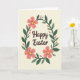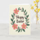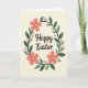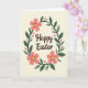 A warm message of Easter sits inside an oval wreath of slender dark branches on a creamy off-white background, giving the whole scene a soft glow 🌷. The wreath is filled with layered leaves in deep forest greens, arranged closely like two friends leaning in for a quiet chat. Coral-pink, five-petaled flowers are tucked between the leaves, each with a sunny yellow center and fine dark lines that add gentle detail. Small pink buds dot the winding branches, like little signs of spring arriving one step at a time. Centered within the wreath, the text reads “Happy Easter” in flowing calligraphy, set in a rich dark maroon that stands out against the pale backdrop. The lettering sits comfortably in the open space, framed evenly by the greenery and blossoms, with a calm, welcoming balance 🐰. Around the wreath, the background stays mostly open and smooth, making the oval garland and maroon words the main focus. The coral blossoms and tiny buds appear at several points along the oval, with yellow centers and dark stamen marks repeating in a neat rhythm.