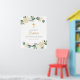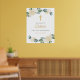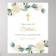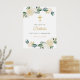 An elegant First Holy Communion welcome poster sign for a girl featuring "Welcome To" and the child's name in gold calligraphy with the communion date, framed by a watercolor wreath of white and cream roses with lush greenery and gold leaf accents. A gold cross tops the design. Ideal for greeting guests at the celebration entrance. Frame not included. All text is fully customizable.