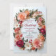 This wedding card features a beautifully crafted floral wreath arranged in an oval shape. The design includes a harmonious blend of soft peach, blush, and deep magenta roses, complemented by delicate white daisies and various green foliage. Small accents of red berries add a touch of vibrancy, while the subtle gradient in the petals gives the flowers a realistic and elegant appearance. The arrangement is balanced and graceful. The overall aesthetic is romantic and sophisticated. Personalize the text regarding the names and details of the wedding. You can download the card to your mobile device or computer. The design was made with the help of ai tech