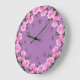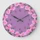 Elegant pink floral wall decor clock designed with pink rose flowers in a round wreath style pattern and classy clock face numbers designed as a bathroom clock, kitchen clock or wall decor clock design.