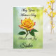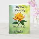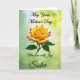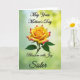 This card centers on a single, fully open rose that feels like a quiet gift between close hearts ❤️. The petals are golden yellow through the middle and fade toward the edges where a rosy red blush gathers, like a gentle flush. A sturdy green stem and a small cluster of deep green leaves sit beneath the bloom, giving it a grounded, garden-fresh look. Behind it, the background shifts softly from leafy green near the bottom to a lighter yellow-green near the top, suggesting morning light in a calm outdoor setting. The soft blur around the flower makes the rose seem even more intimate, as if you’ve stepped close for a private moment. Dark, flowing text appears above the rose with a short affectionate line, and a second matching line sits below, framing the flower without crowding it 🌼. The main rose stays sharply detailed while the background fades into gentle circles of light in green and yellow tones.