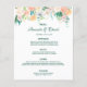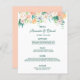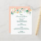 An elegant and romantic wedding menu card. Watercolored roses, flowers in white, blush pink, orange with green foliage. Templates for your names, date and wedding menu. White background on front, copper colored on back. Green letters.