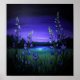 This whimsigoth poster features a mesmerizing purple amethyst night sky overlooking a moody quiet pond nestled in a secret flower field. Finished in an oil paint art print.
