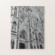 The item displays a jigsaw puzzle featuring a highly detailed black-and-white photograph of an intricately designed cathedral facade. The architectural elements, including ornate arches, statues, and carvings, create a complex and visually captivating puzzle. This puzzle is perfect for architecture enthusiasts, art lovers, or anyone who enjoys challenging and rewarding activities. The monochrome color scheme adds an elegant and timeless quality, making this puzzle a beautiful display piece once completed. It's an ideal gift for puzzle aficionados and those who appreciate fine architectural details.