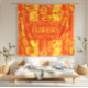 A colorful, lively two toned design with bright yellow and orange flowers against a striped yellow and orange background.