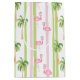 This gift bag features pink flamingos wearing Santa hats and palm trees with Christmas lights on a pink and green striped background.