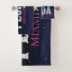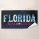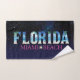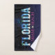 This trendy, elegant summer Bath Towel Set of 2023, A design that contains the word Florida, with the effect of the sea, the sun, and trees, and is characterized by the blue colors of the sea and yellow sand, and underneath it is the word Miami Beach in fuchsia