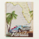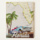 Beautiful illustrated map of the state of Florida and islands in the region in a beautiful vintage style featuring a retro 1950s car.