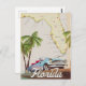Beautiful illustrated map of the state of Florida and islands in the region in a beautiful vintage style featuring a retro 1950s car.