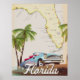 Beautiful illustrated map of the state of Florida and islands in the region in a beautiful vintage style featuring a retro 1950s car.