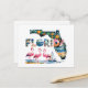 Greetings from Florida! Iconic Florida state shape outline map filled with tropical pink flamingos, orange grove scenes, and coastal beach scenery. Pretty Florida souvenir postcards to keep or send.