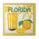 A graphic illustration of a happy sunshine,oranges,and orange juice on a Florida decorator tile. Original artwork: Copyright Charmaine Paulson