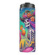 Very colorful tumbler with feminine Skelton riding a flamingo.