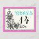 Flourish vine black pink turquoise wedding table number postcard, featuring a black vine with flowers with turquoise blue center, a double black and hot pink border and an elegant formal script font on ivory/ecru background. A contemporary, floral design with a touch of vintage, perfect for a modern or traditional spring or summer wedding. This stylish design can be used for other special occasions such as birthdays, engagements or anniversaries.