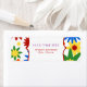 A simple elegant address label featuring a background of brightly colored flowers in shades of red, yellow, blue, green, and orange. Personalize the purple and red text with your name at address.