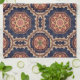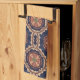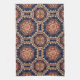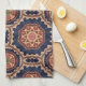 Kitchen towel with a repeating pattern of decorative elements in flower, star and sun shapes.