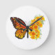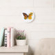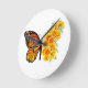 Orange, detailed monarch butterfly with wing decorated with yellow, vibrant California poppy on white background.