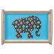 Beautiful folk art style gifts, accessories and decor with flowery patterned elephant silhouette on light blue background.
