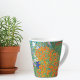 A latte mug with the Austrian artist Gustav Klimt's landscape painting, Flower Garden or Bauerngarten, (1907). A beautiful blooming garden of flowers in orange and purple, including asters and petunias.
