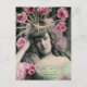 Vintage painted photograph of young woman wearing a hat with what looks like pink carnations extending above her head on stalks