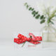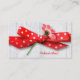 single flower stuck in red ribbon with white polka dots on whitewashed wood
