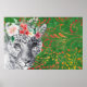 Beautiful watercolor collage features white and black watercolor leopard with full color floral crown on a jungle inspired batik background