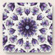 Flower mandala coaster with a kaleidoscopic pattern created from a watercolor and ink drawing of an abstract lotus flower in blue, violet and black.