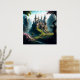 This is a poster of a beautiful, imaginative, classic fairy tale castle in a lush, green meadow with pink flowers. It was made using Leonardo.ai.