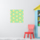 The flower of life symbol in a repeat lined large pattern in white with lime-yellow petals and a light teal background.