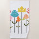 This beach towel has a mid-century modern design of flower made from squares, ovals, and diamonds that have been manipulated to form flowers.
