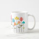 This mug has a mid-century modern design of flower made from squares, ovals, and diamonds that have been manipulated to form flowers.